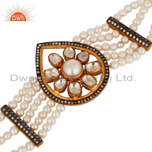 18K Gold Plated Sterling Silver Pearl & Crystal Polki Designer Bracelet