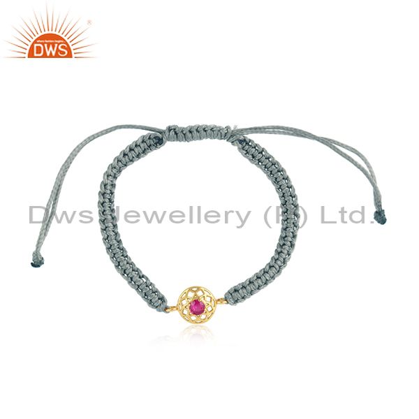 Chakra Designer Gray Cord Gold On Silver Bracelet In Red Cz