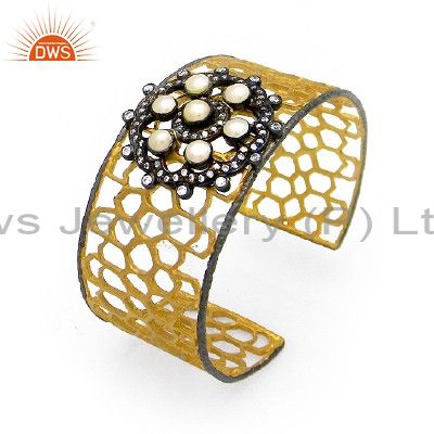 24K Gold Plated Sterling Silver Pearl And Cz Handcrafted Wide Cuff Bracelet