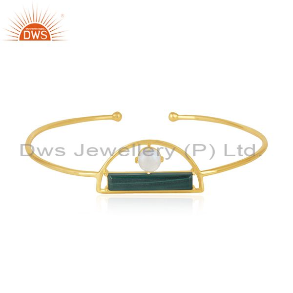 Malachite And Rainbow Moonstone Designer 925 Silver Gold Plated Cuff Bracelet