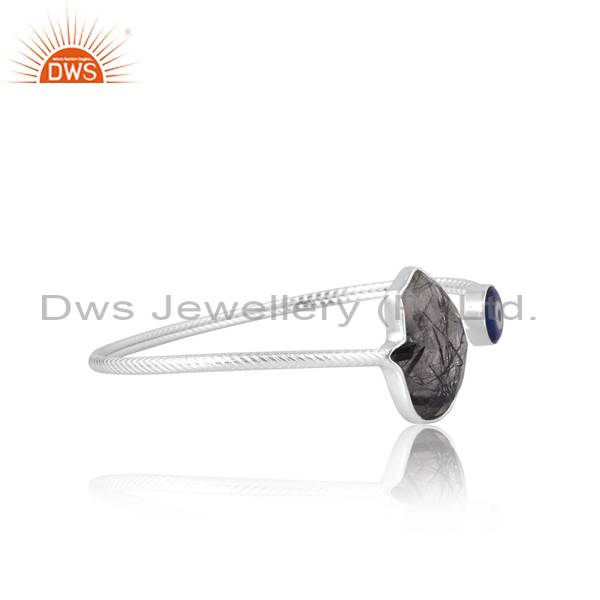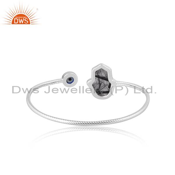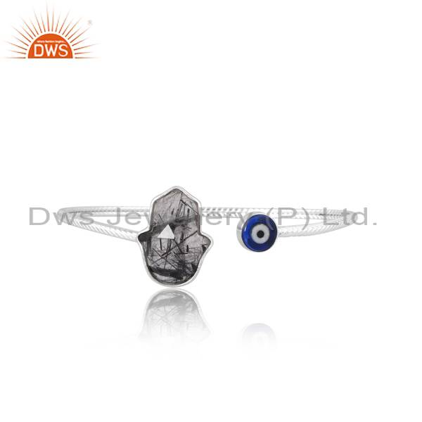 Stylish Black Rutile Hamsa Cuff - Blue Resin Detail
