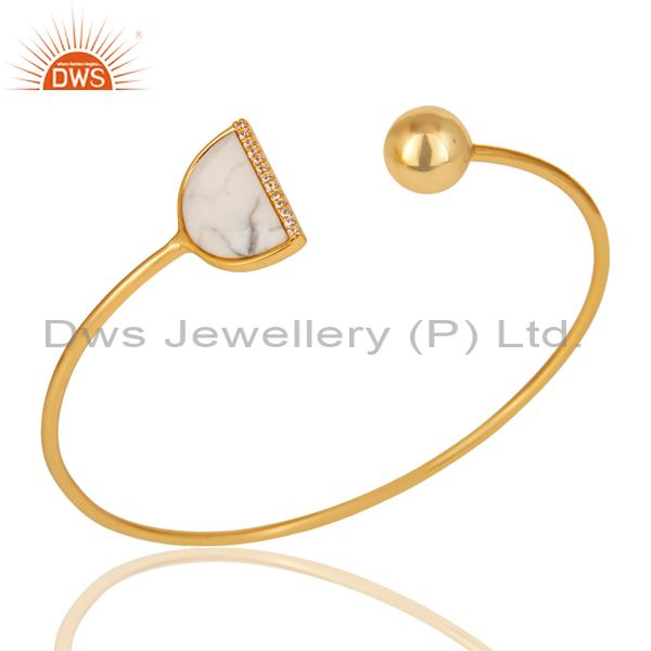 White Howlite CZ Sleek 14K Gold Plated Sterling Silver Cuff Bangle Jewelry