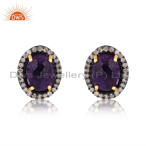 14K Solid Yellow Gold Amethyst Gemstone Ladies Stud Earrings With Pave Diamond
