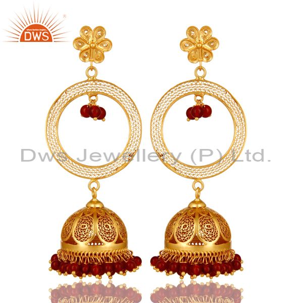 14K Yellow Gold Plated Sterling Silver Red Onyx Traditional Jhumka Earrings