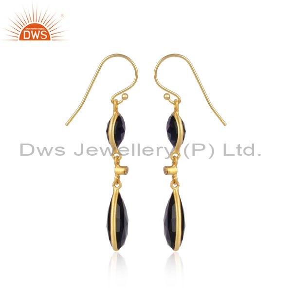 18K Gold Plated Sterling Silver Blue Sapphire Corundum Bezel Set Dangle Earrings