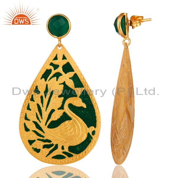 18K Yellow Gold Over Brass Handmade Green Onyx Designer Peacock Dangle Earrings