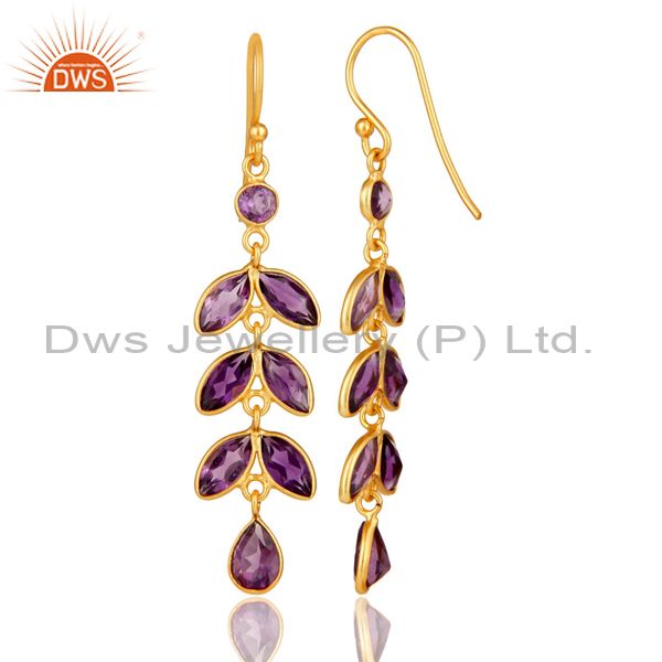 18K Yellow Gold Plated Sterling Silver Amethyst Designer Leaf Dangle Earrings