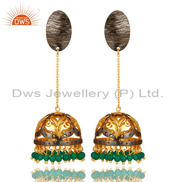 18K Yellow Gold Plated Sterling Silver Natural Green Onyx Beads Jhumka Earrings