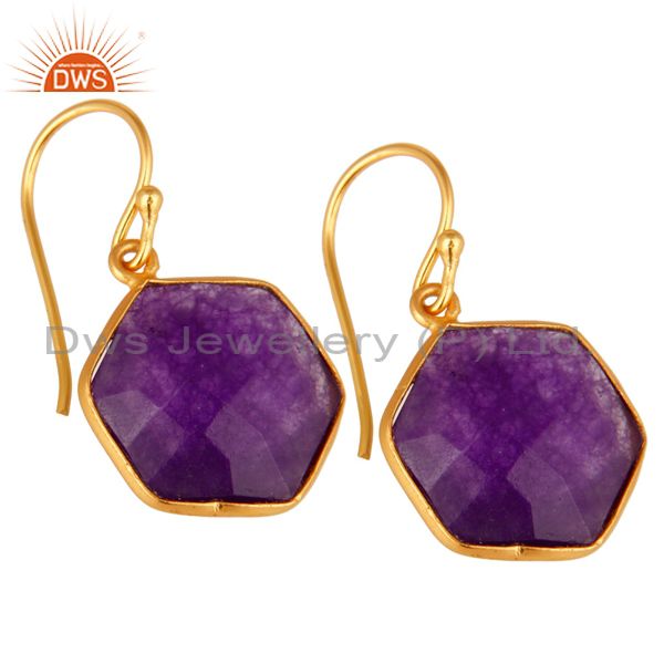 18K Yellow Gold Plated Sterling Silver Purple Chalcedony Bezel Set Hook Earrings