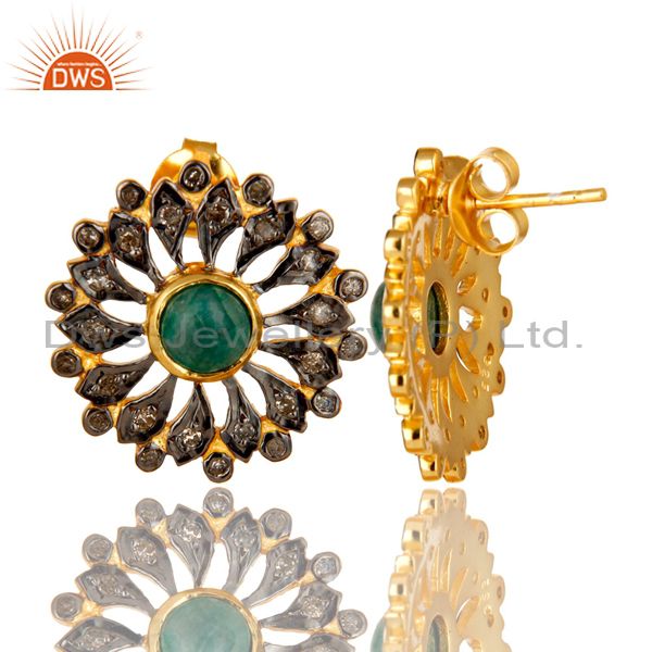 18K Yellow Gold Sterling Silver Emerald And Pave Diamond Flower Stud Earrings