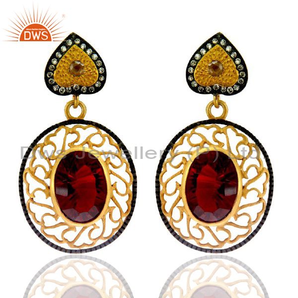 22K Yellow Gold Plated Brass Red Ruby Glass And Cz Designer Dangle Earrings