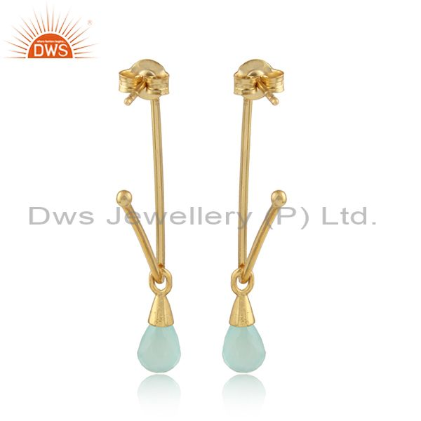 Aqua Chalcedony Gemstone Designer Gold Plated Silver Earrings