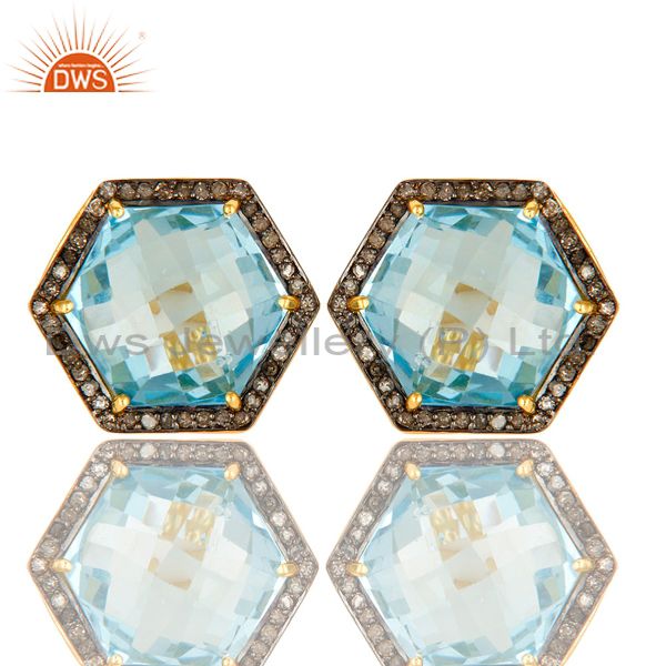 Blue Topaz And Pave Set Diamond Hexagon Stud Earrings Made In 18K Gold On Silver