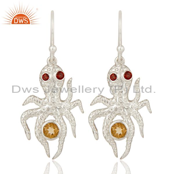 Citrine and Garnet Gemstone Sterling Silver Octopus Dangle Earrings