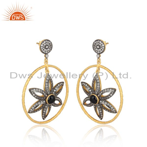 Cz And Black Onyx Gold, Black On Silver Floral Hoop Earrings