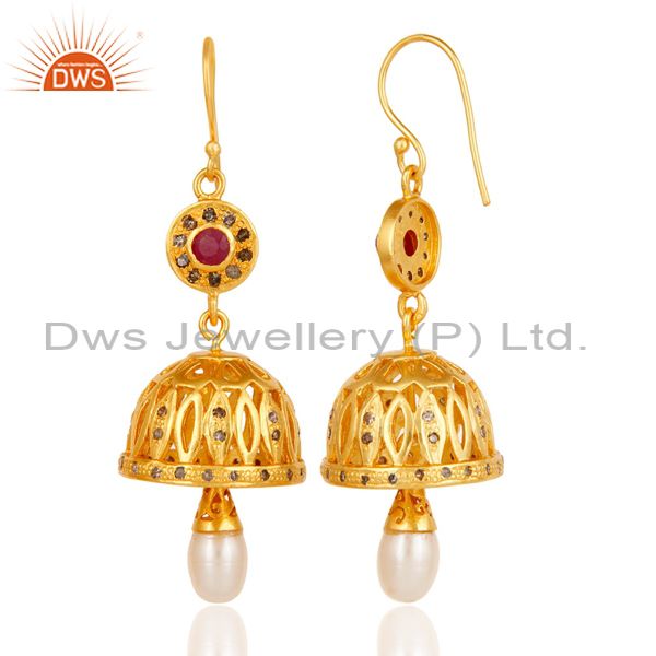 Diamond, Ruby & Pearl 18k Gold Plated 925 Sterling Silver Jhumka Earrings