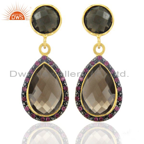 Estate 18Kt Gold Over Sterling Silver Smoky Quartz Pear Ruby Drop Earrings