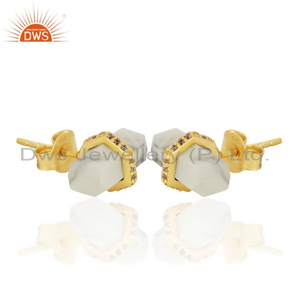 Howlite Cz Studded Pencil Post 14K Gold Plated Sterling Silver Earring