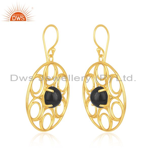 Prong Setting Black Onyx Gemstone Gold Plated Sterling Silver Earrings
