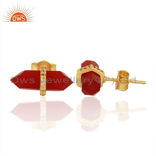 Red Onyx Cz Studded Pencil Post 14K Gold Plated Sterling Silver Earring