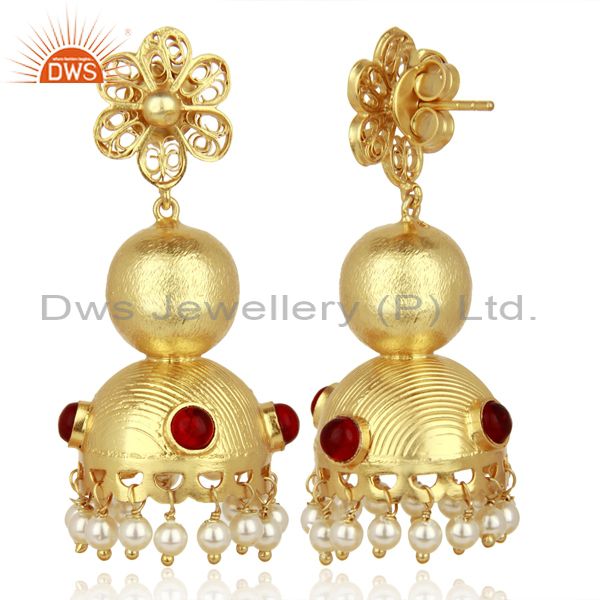 Red Stone Studded Traditional Bollywood Jhumka Gold Plated 92.5 Silver Jewelry