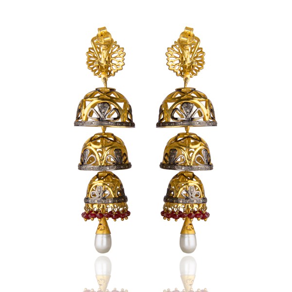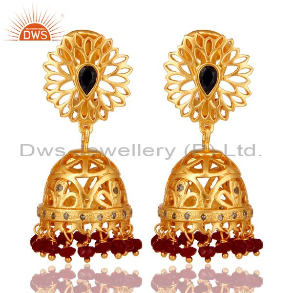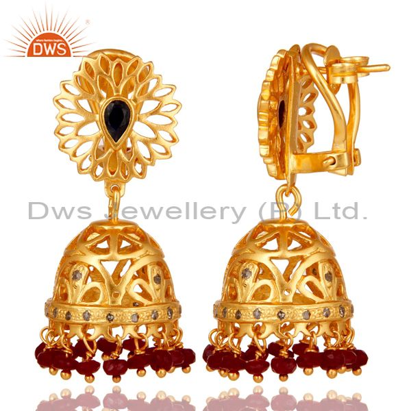 Ruby, Blue Sapphire And Diamond Gold Plated Sterling Silver Jhumka Earring