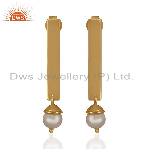 Simple Bar Design 925 Silver Gold Plated Pearl Earrings Manufacturers