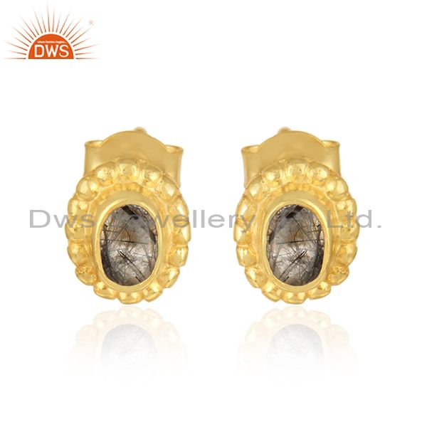 Textured Dainty Stud in Yellow Gold over Silver with Black Rutile