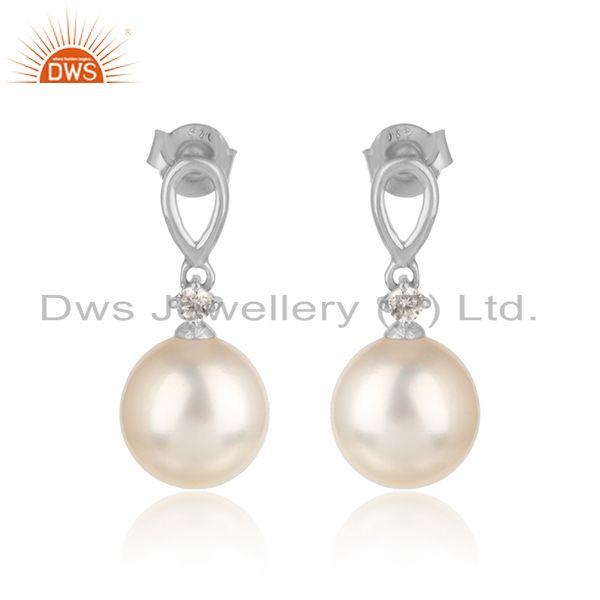 White Rhodium Plated Silver Girls CZ Pearl Gemstone Earrings