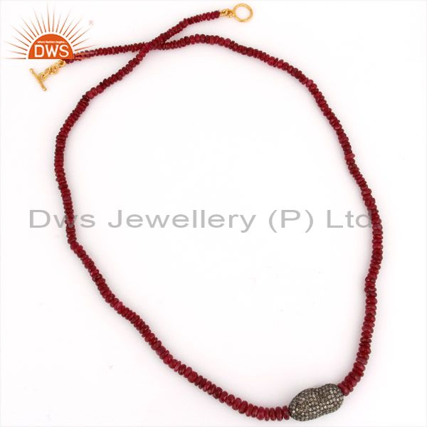 18K Gold Pave Diamond Natural Ruby Gemstone Beads Single Strand Necklace