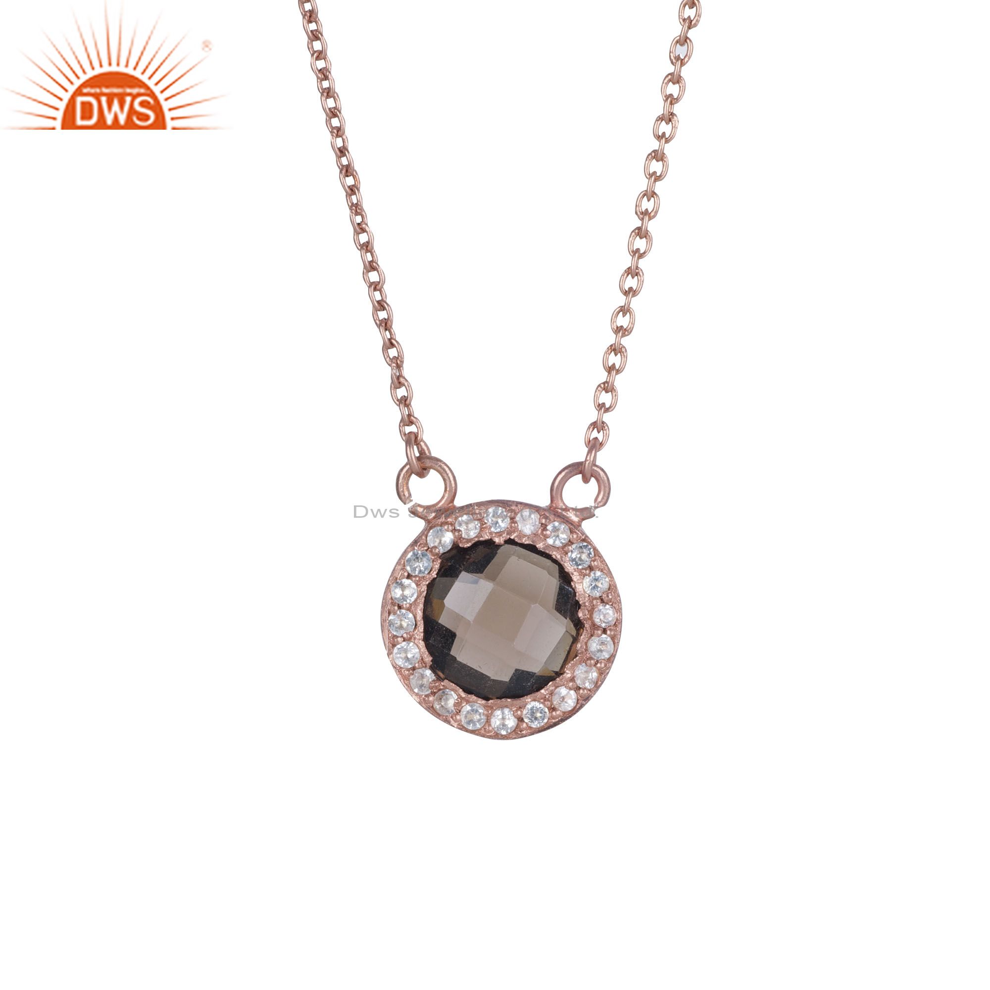 18K Rose Gold Plated Silver Smoky Quartz And White Topaz Pendant Chain Necklace