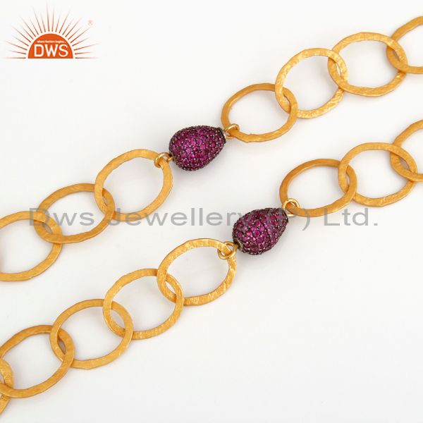 24K Gold Over Sterling Silver Double Chain Link Necklace With Pave Ruby Beads