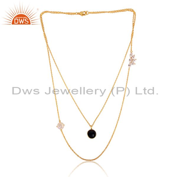 Cz, Black Onyx, Rainbow Moon Stone 18K Brass Gold Necklace