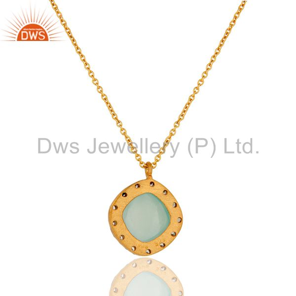 Gold Plated Sterling Silver Aqua Glass & Cubic Zirconia Fashion Pendant Neckla