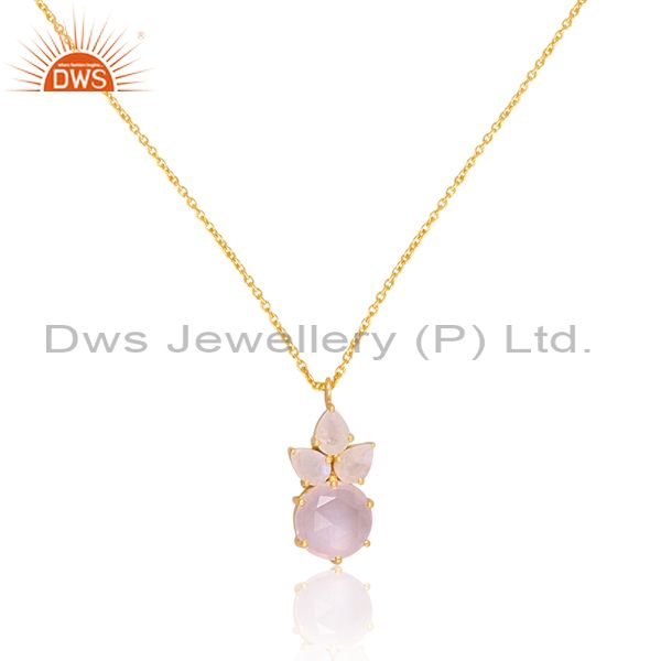 Rose Quartz Set Round Pendant And Gold On 925 Sterling Chain