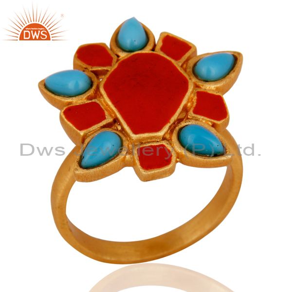22K Yellow Gold Plated Brass Turquoise And Red Enamel Cocktail Ring