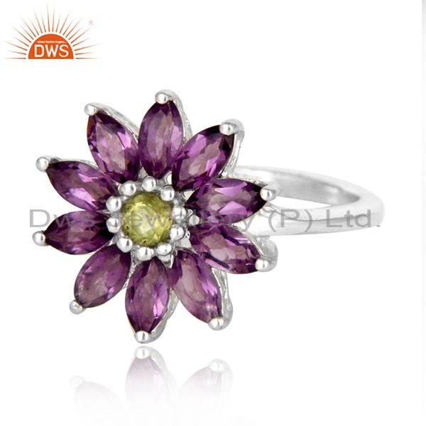 925 Sterling Silver Amethyst And Peridot Gemstone Flower Cocktail Ring