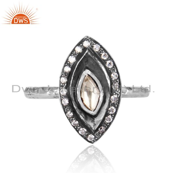 CZ And Crystal Quartz Set Oxidized Silver Tear Shaped Ring