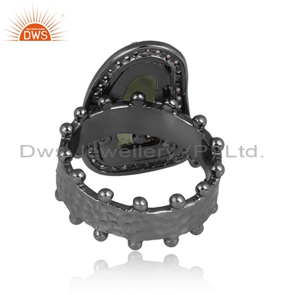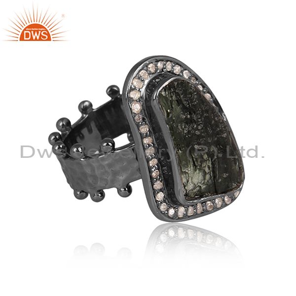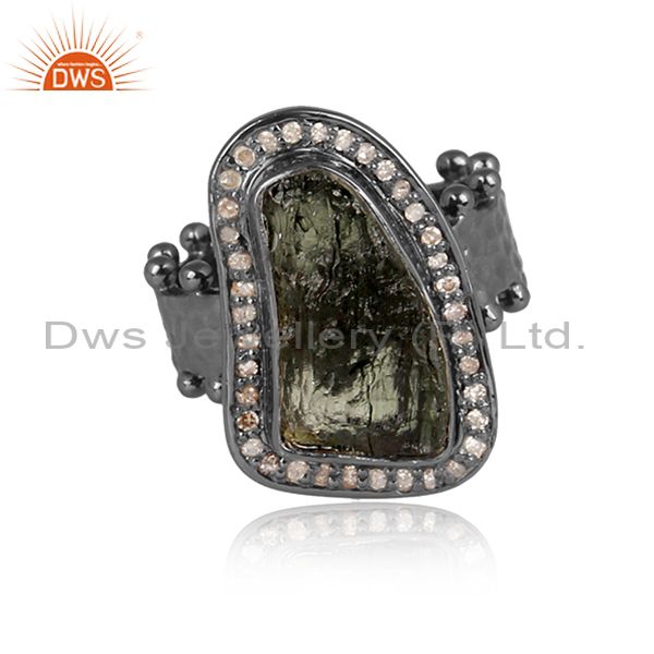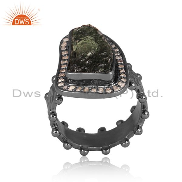 Diamond And Moldavite Set Black On Silver Boho Style Ring
