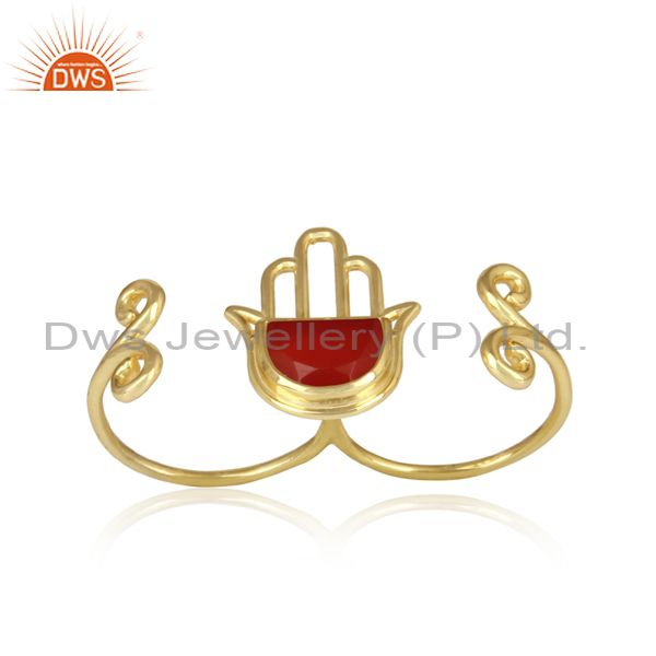 Gold Plated 925 Silver Red Onyx Coin Set Hamsa Hand Ring